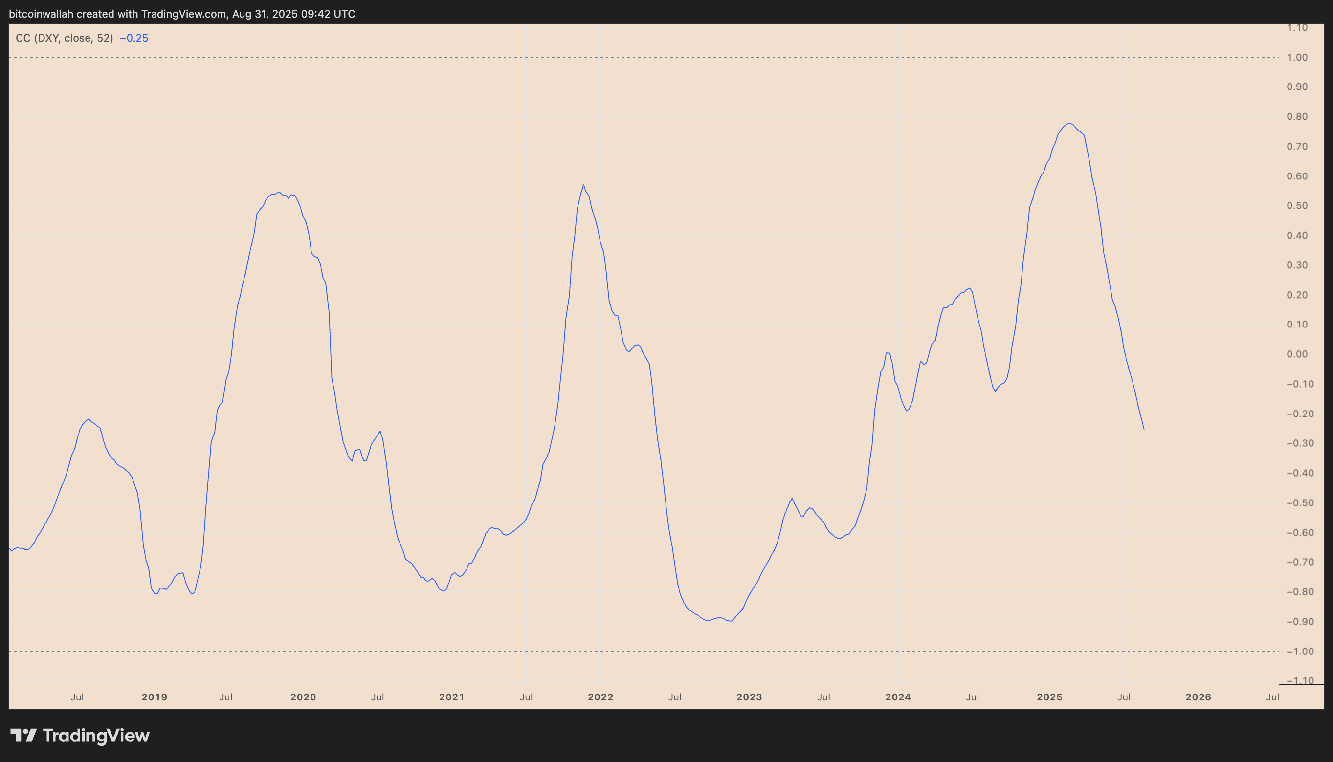 As of Sunday, the 52-week correlation between Bitcoin and the US Dollar Index (DXY) had slipped to −0.25, its weakest level in two years.