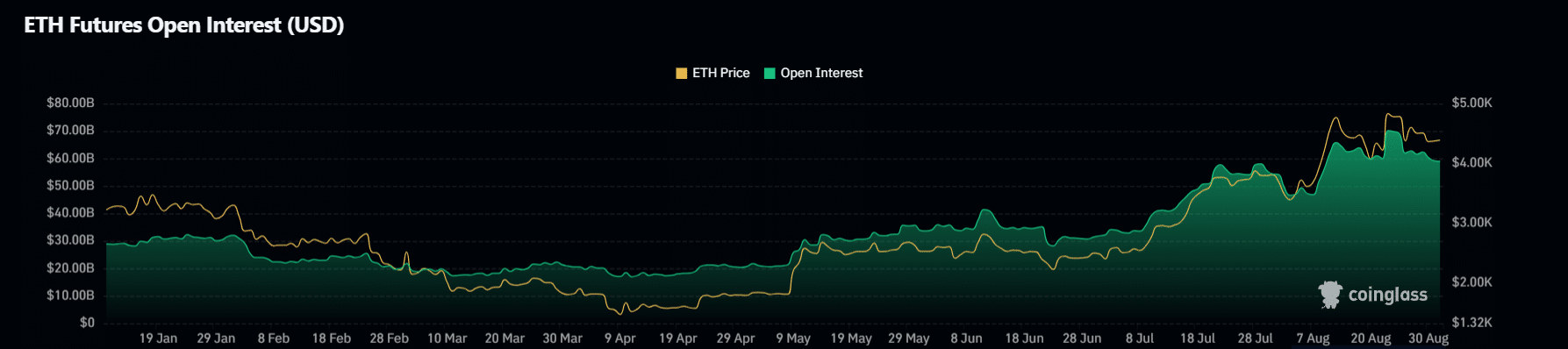 At the same time, ETH’s Futures Open Interest surged past $70 billion before settling near $60 billion.