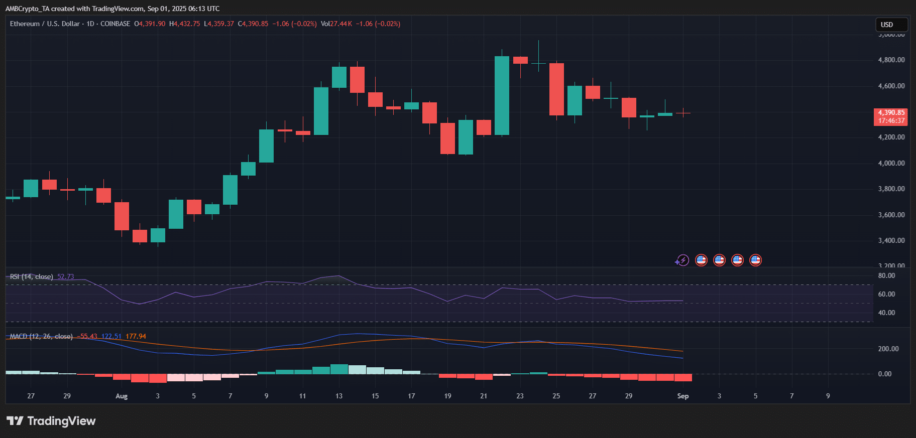 At press time, Ethereum traded near $4,390, moving sideways after its strong rally earlier in August.