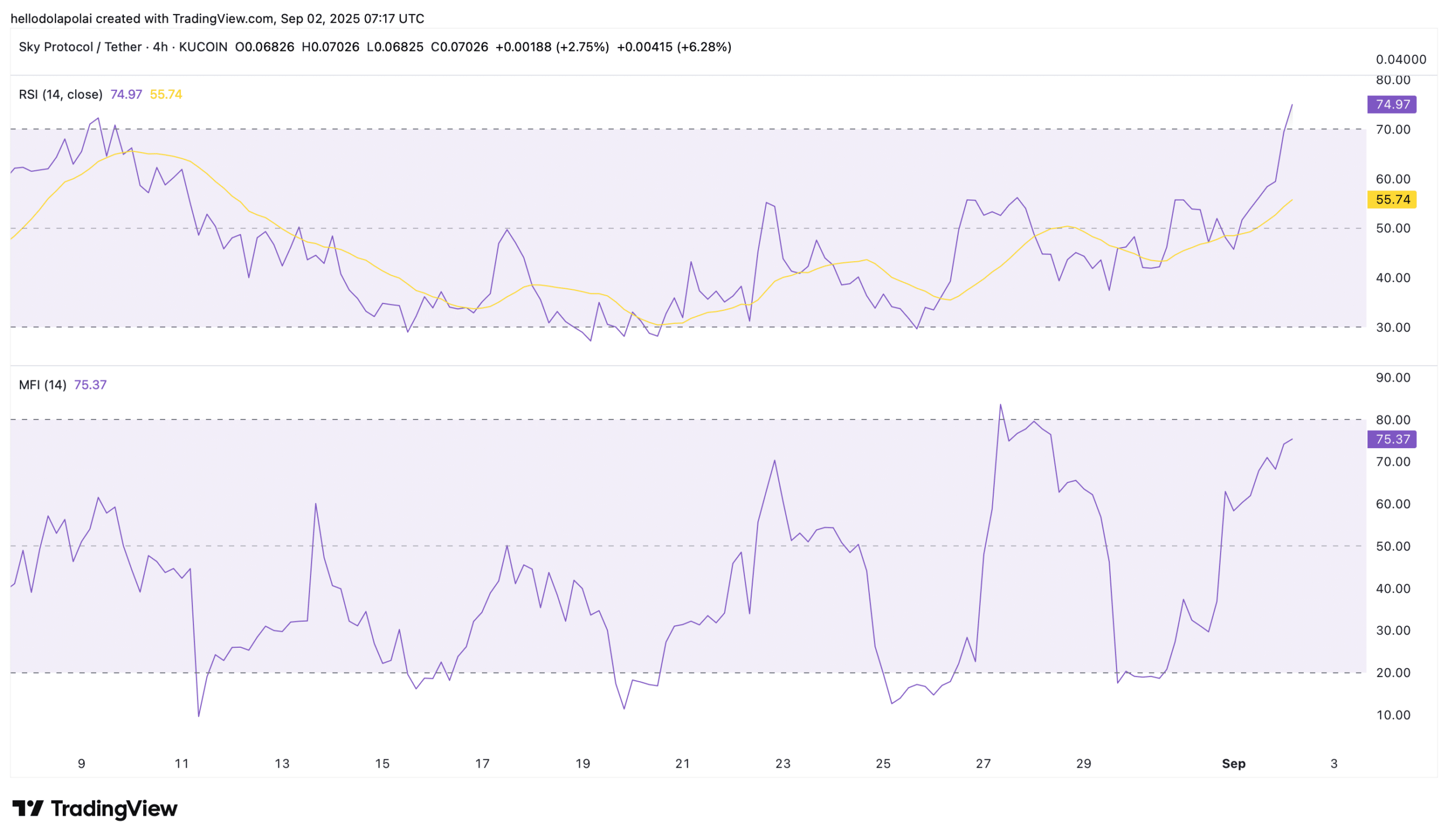The Money Flow Index (MFI), on the other hand, shows it is extending toward the overbought region above 80 but has not reached it yet.