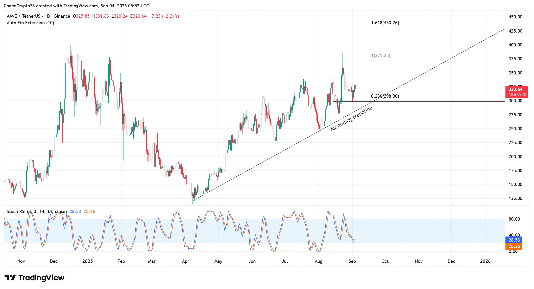 At the time of writing, AAVE was trading at $320.76 after a 1.72% daily gain.
