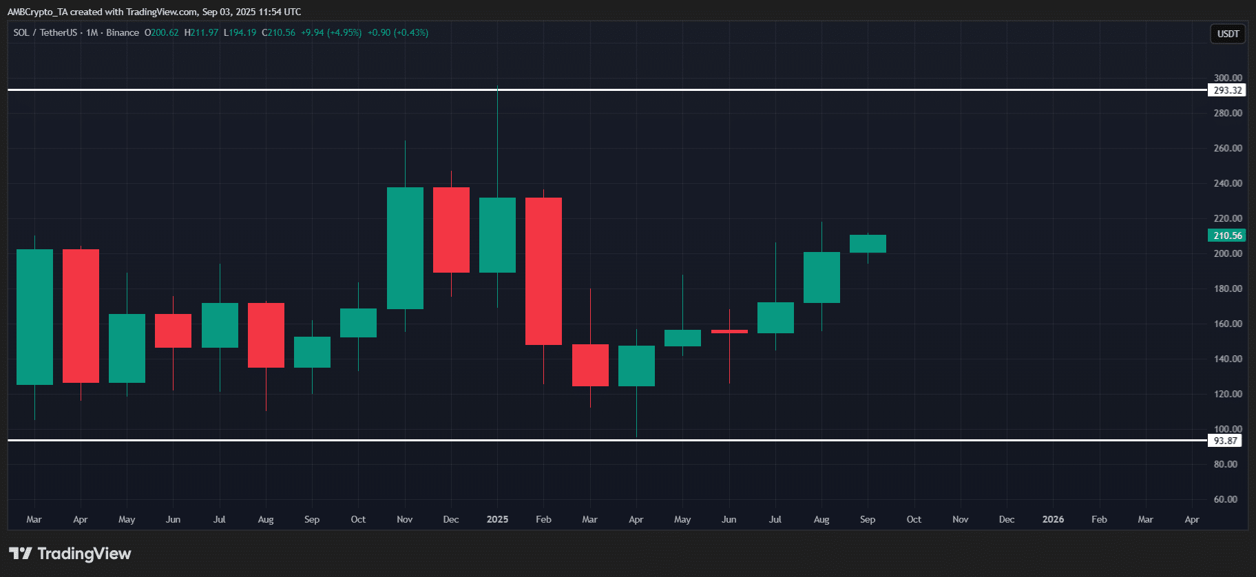 SOL’s MoM gains are solid, but it’s still 30% off its January $295 peak, feeling the drag from the Fed and Trump-era tariffs. BNB, meanwhile, pushed more bullishly.