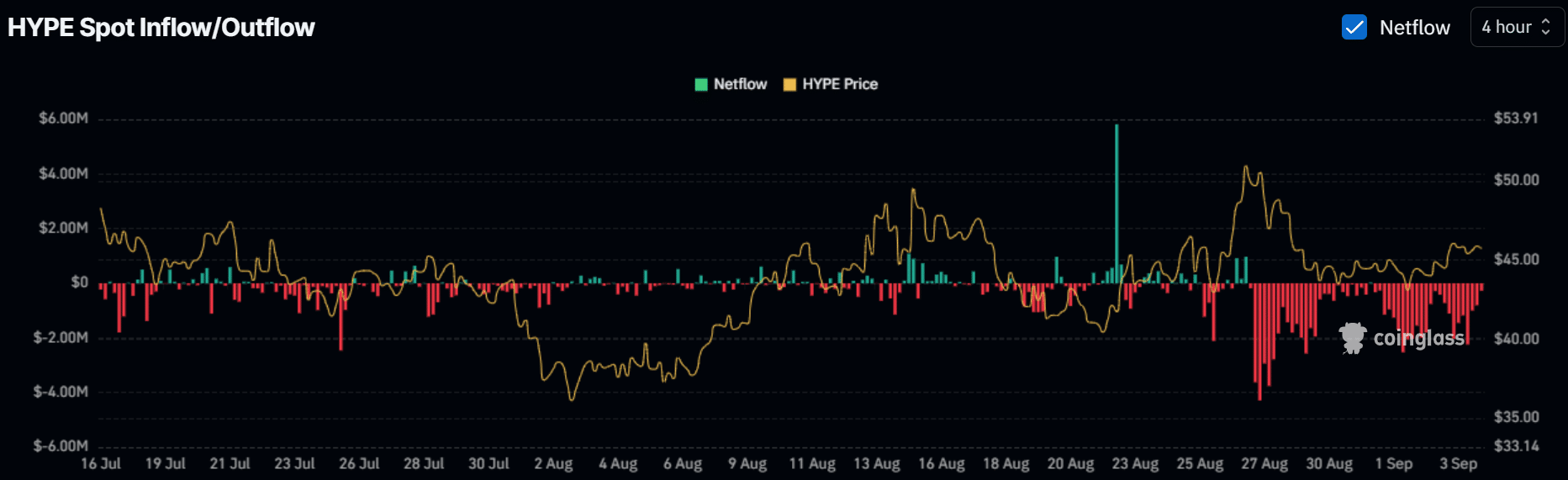 The bullish outlook was also evident on the spot markets. According to Coinglass, there were net outflows (red bars) on exchanges during HYPE’s pullback from $50.