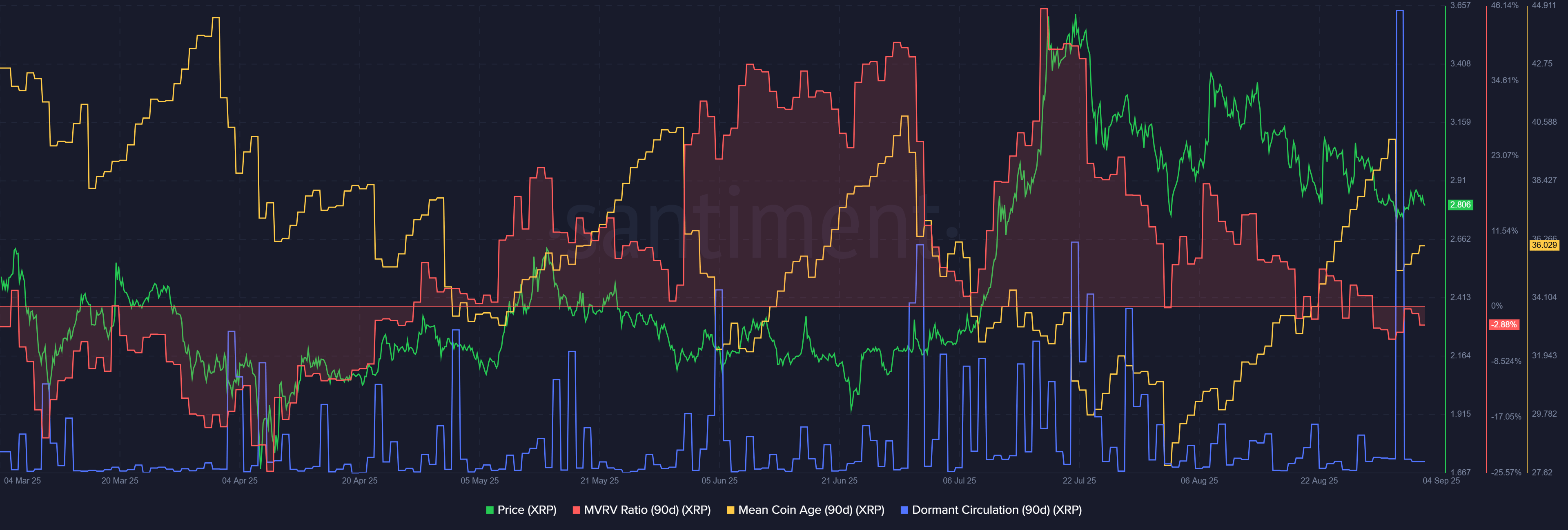 A worrying sign was the sharp spike in the dormant circulation among medium-term holders. This spike came on 01 September, when XRP briefly fell to $2.6975 before bouncing slightly.