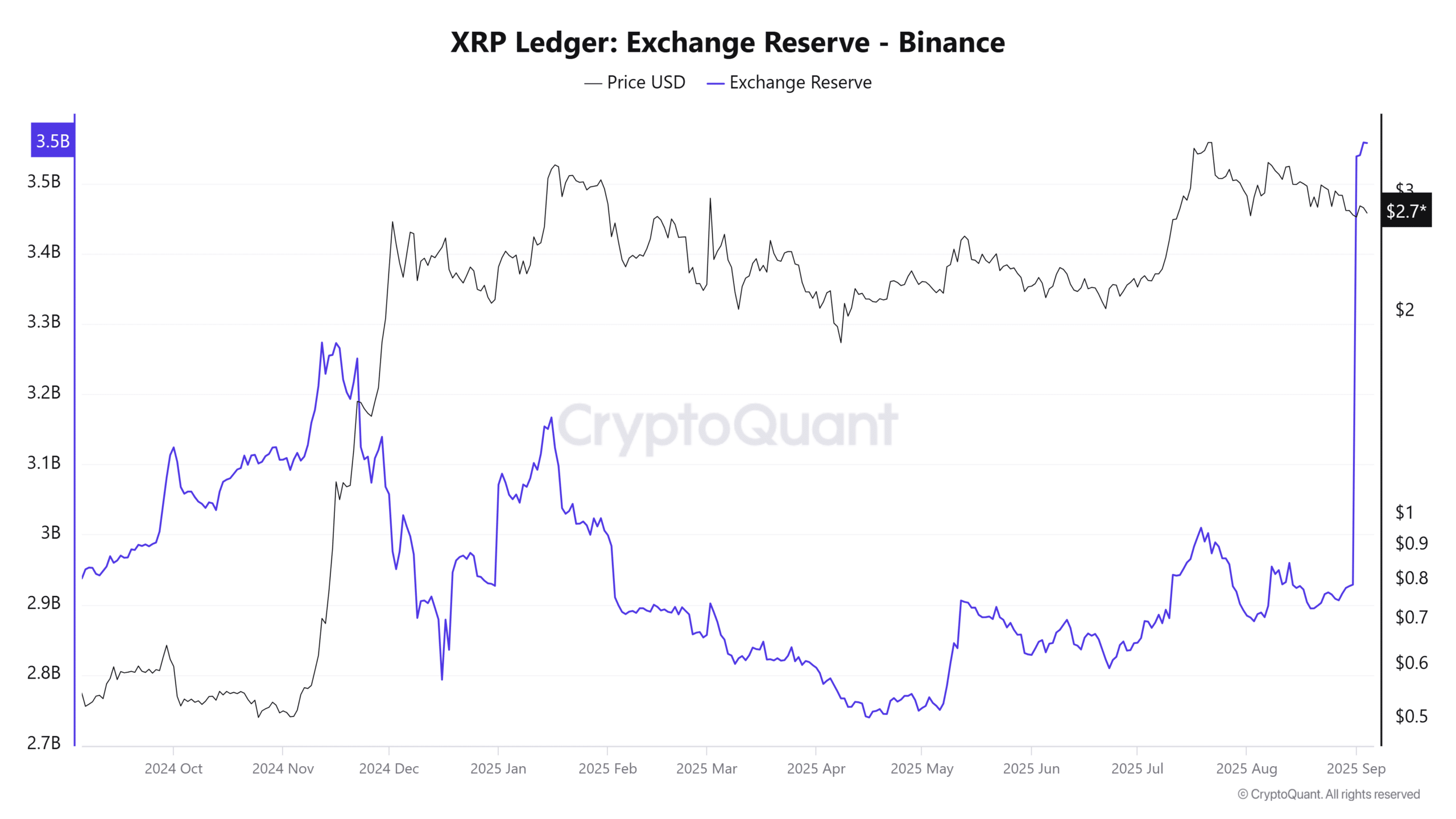 The bearish breakdown from $2.74 was made more likely by XRP exchange reserves springing higher. The inference of selling pressure from the dormant circulation metric’s spike was likely correct, as XRP exchange reserves surged to highs not seen in over a year.