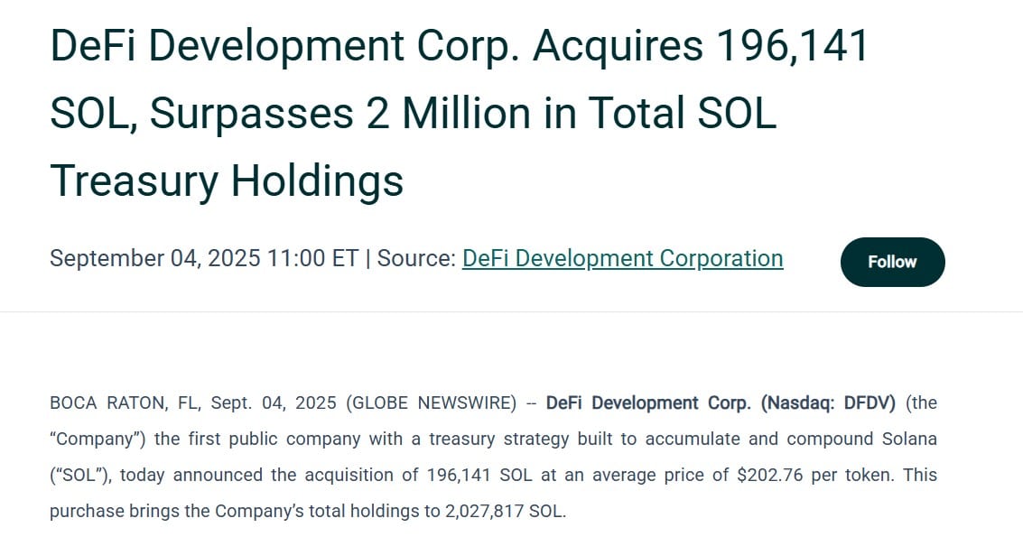 DeFi Development Corp. has bolstered its Solana holdings to over 2 million tokens. As Solana rallies past $200 and prepares for the Alpenglow upgrade, institutional interest is on the up too.