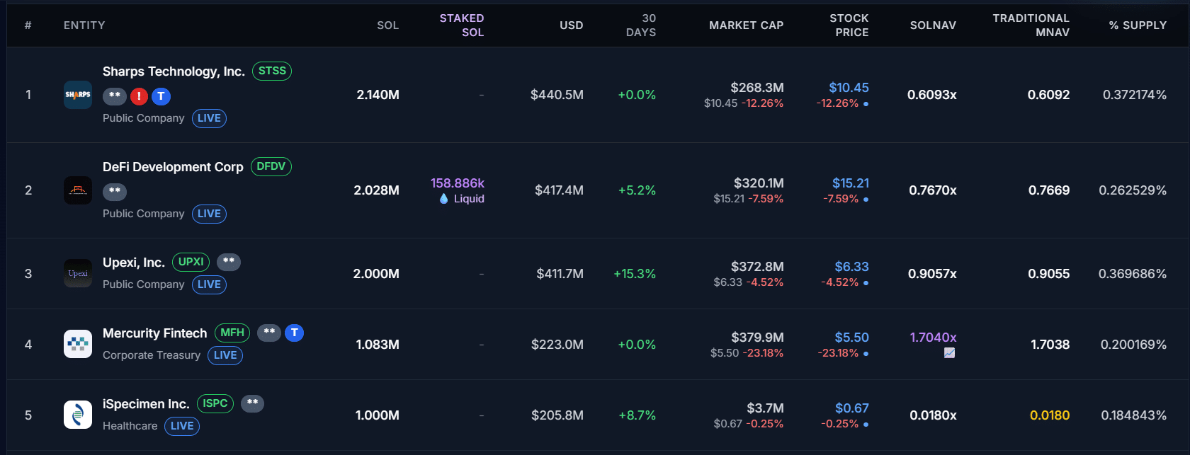 Upexi, Inc., Mercury Fintech, and iSpecimen round out the list with 2M, 1.08M and 1M SOL, respectively. Together, these five firms now control over $1.7 billion worth of SOL.