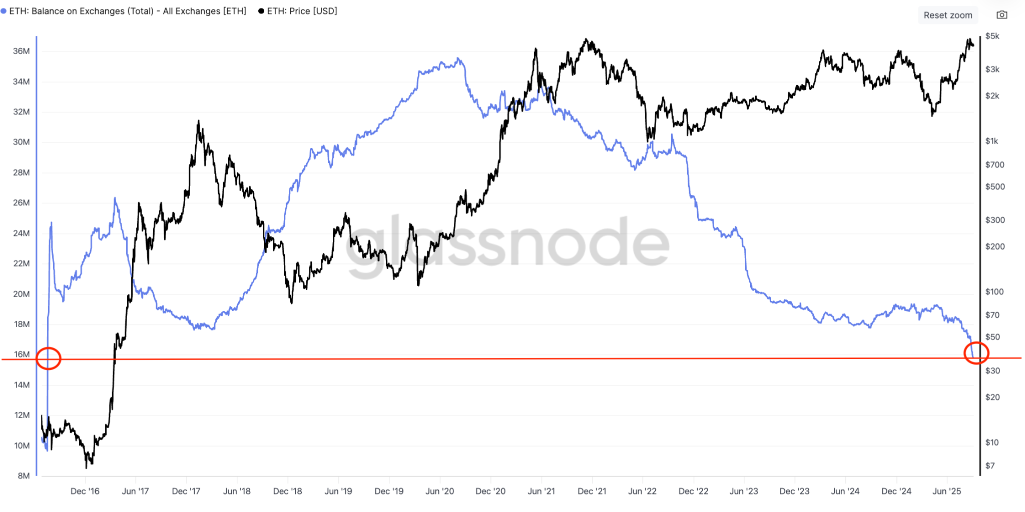 As Cointelegraph reported, overall exchange ETH balances are at their lowest in nine years. Ether balance on exchanges is 15.72 million ETH as of Friday, levels last seen in July 2016, per Glassnode data.