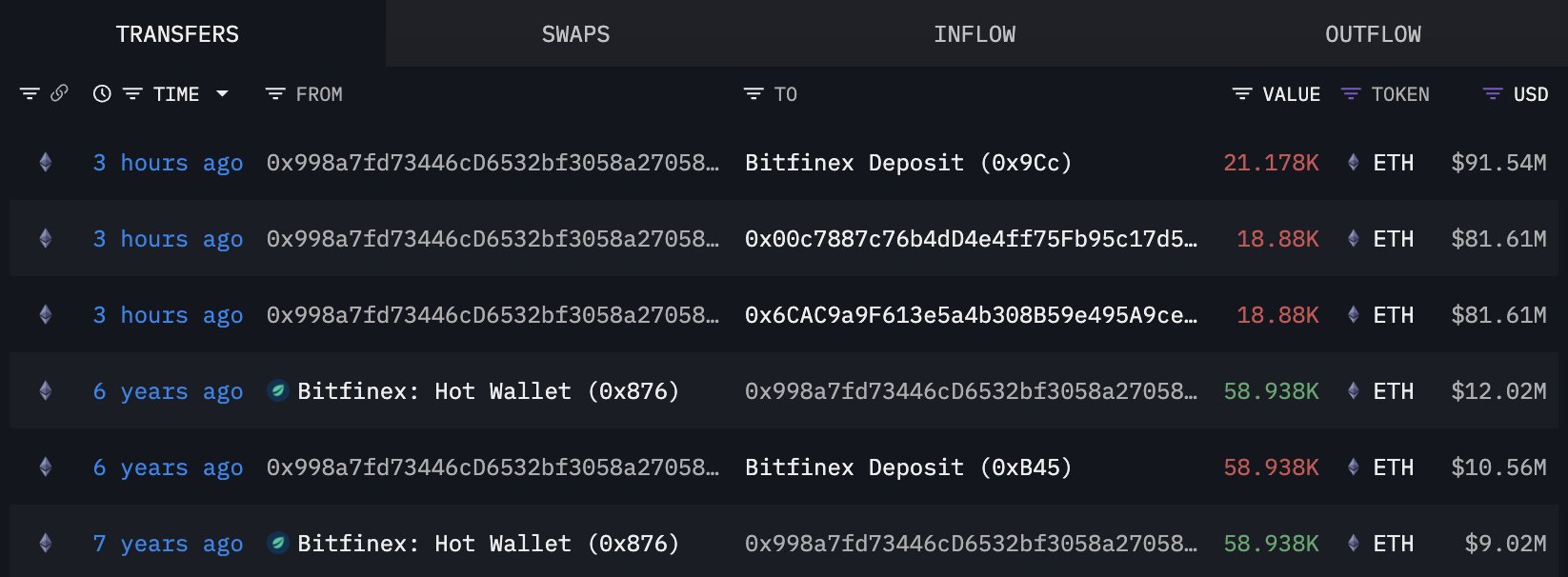 Of this, 21,178 ETH, worth $91.54 million, went to Bitfinex, suggesting intent to sell.