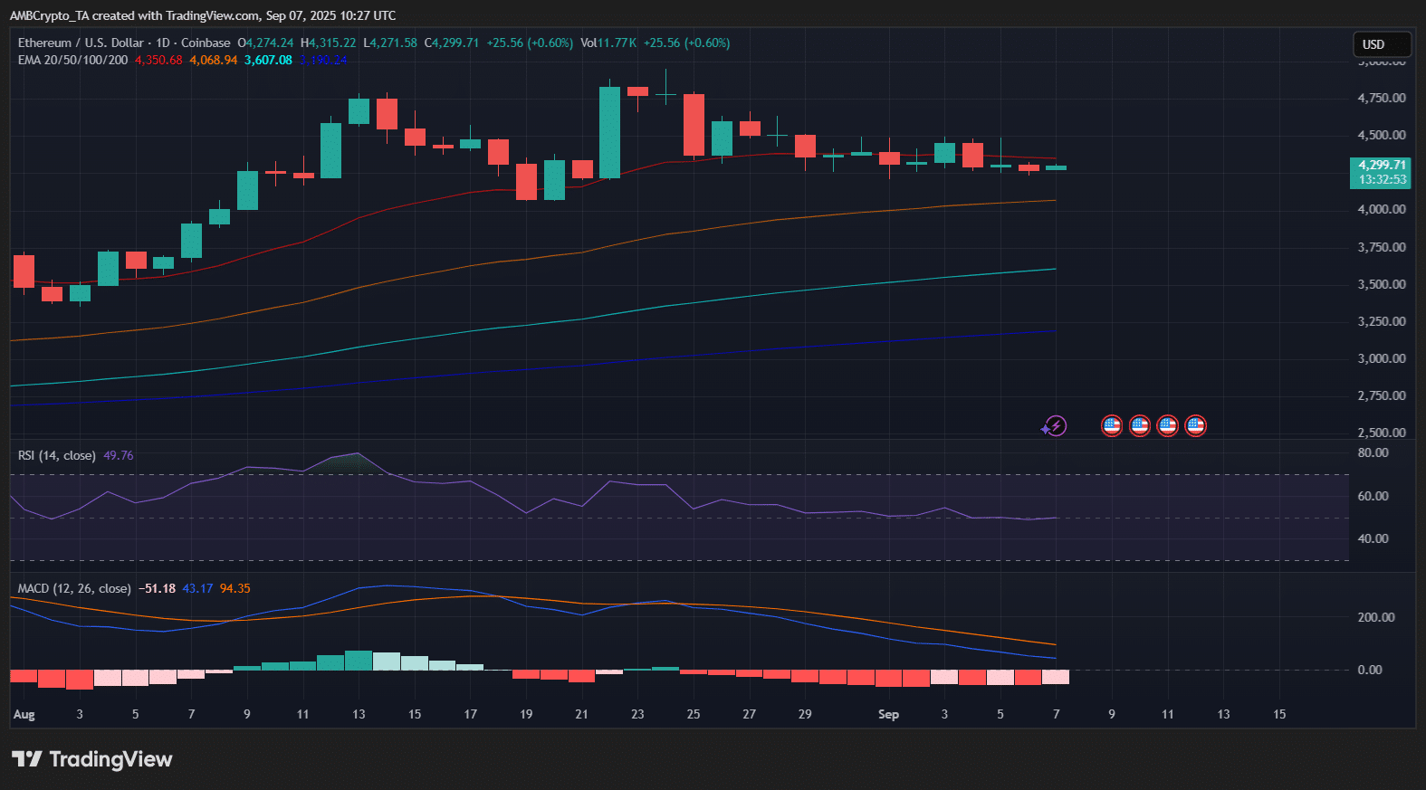 At press time, Ethereum traded at $4,299, holding above its 50-day EMA but struggling to reclaim the highs seen earlier in August.