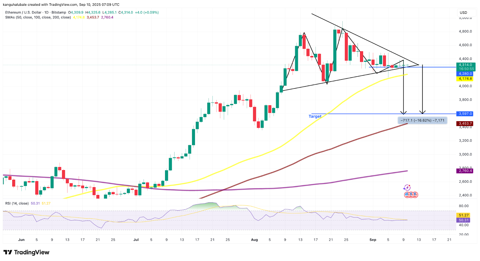 A daily candlestick close below the triangle could attract more bears that will look to push the price down to $3,600, or down 16% from the current level.