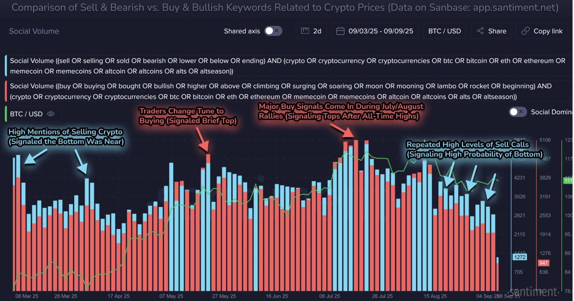 Crypto social volume: Bullish vs. bearish key words. Source: Santiment