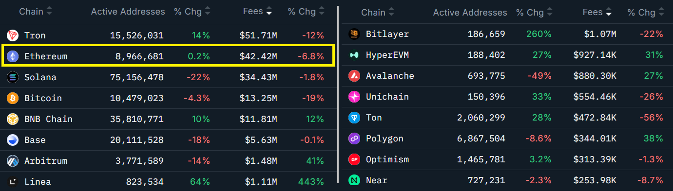 Ethereum chain fees totaled $42 million over 30 days, down 7% from the previous month. By comparison, fees on Tron dropped 12%, and Solana experienced a 2% decline. The number of active addresses on Ethereum’s base layer remained flat, while layer-2 solutions such as Base, Arbitrum, and Polygon saw significant declines.