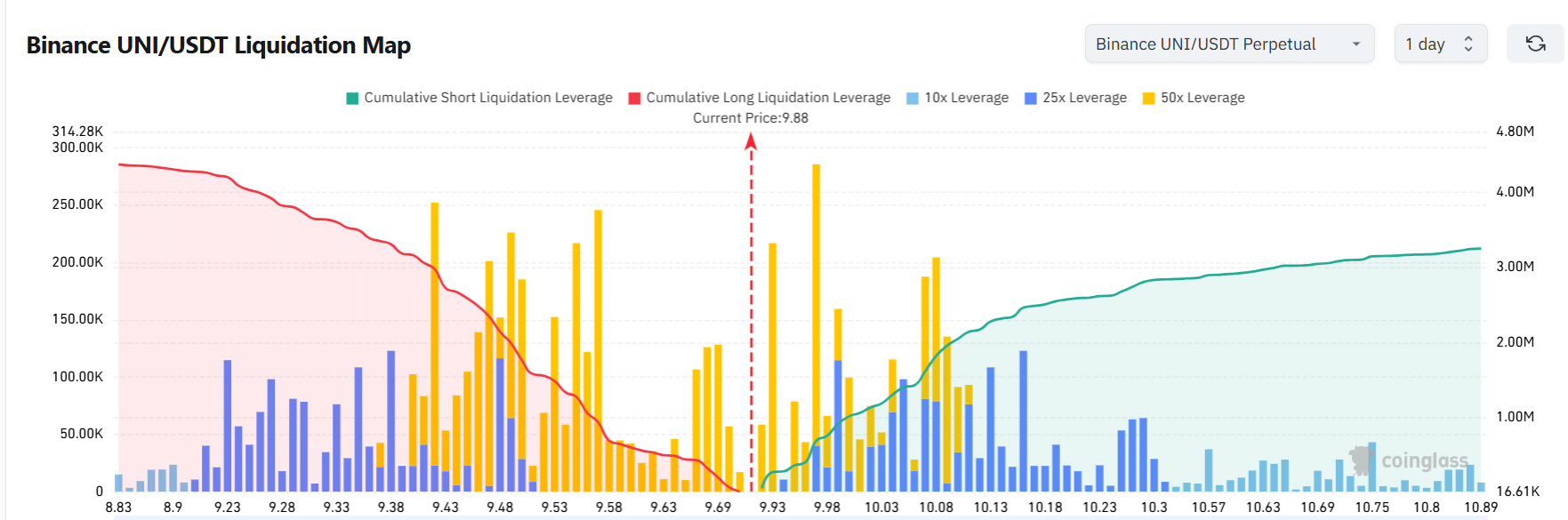 The Binance UNI/USDT liquidation map highlights significant clusters around the $9.88 current price level, where both long and short liquidations remain densely packed.