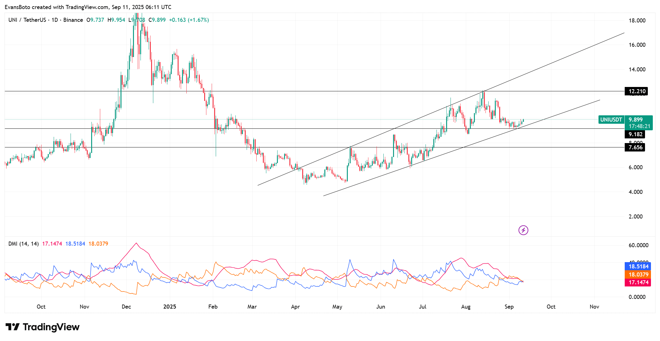 UNI has been trading within an ascending channel, holding above $9.18 support at press time, while deeper protection lie around $7.65.
