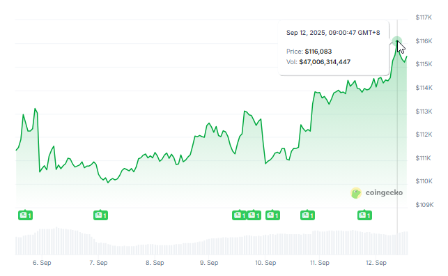 Bitcoin has pulled back above the $116,000 mark. Data from Coingecko show BTC trading at $116,083, a daily move of 0.25% and up 3% over the past week.