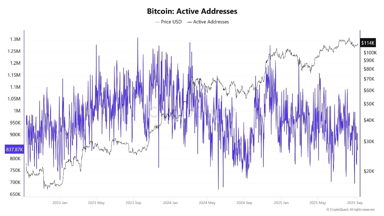 This reduces available supply on trading venues and can fuel upward moves in the coin price as new demand appears. The active address count does not show major surges, but there’s a clear trend of more steady, long-term holders keeping coins off exchanges rather than flipping for quick profits.