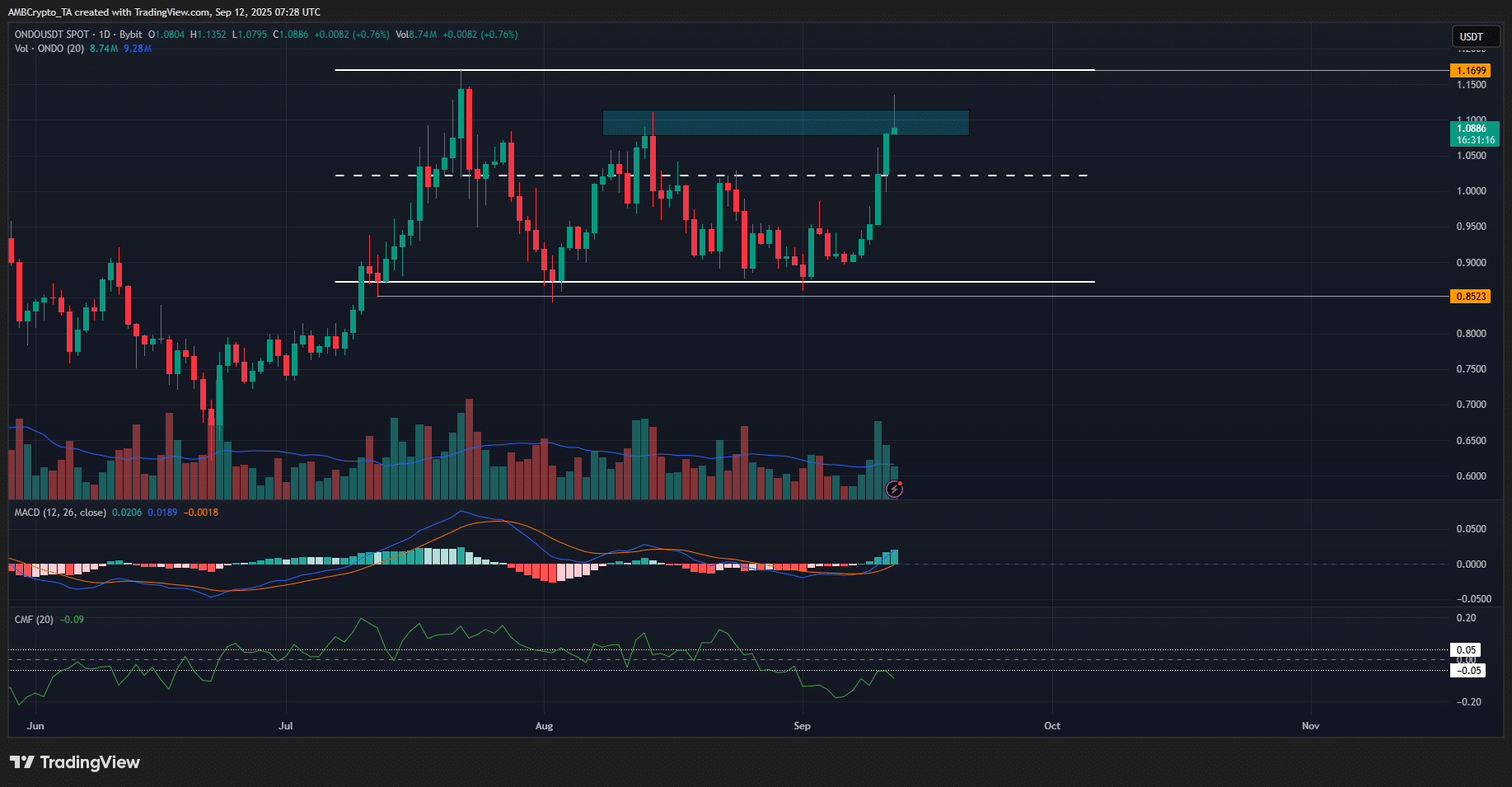 At the time of writing, the price was at a key supply zone from mid-August at $1.08. Another 7% move higher would take ONDO to the range highs. However, it was unclear if the current move could reach the range highs.