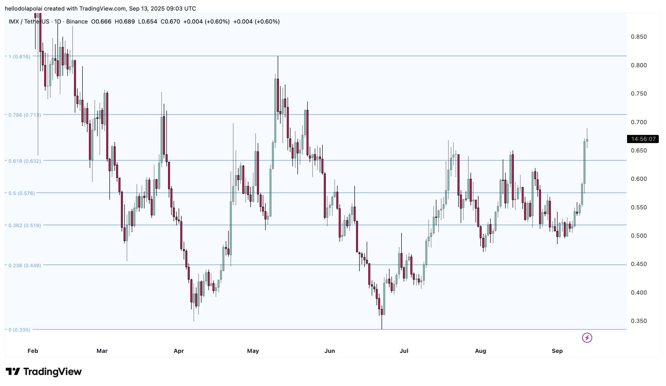 Analysis of price charts using Fibonacci retracement tools shows that a key level IMX needs to overcome is the resistance at $0.713, confirming it can reclaim the $1.5 billion market capitalization.