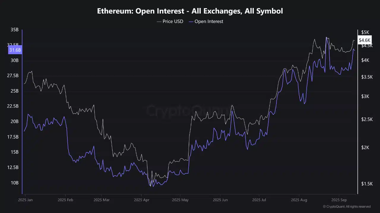 Exchange reserves have dropped more than 20% since May, showing ETH being moved into long-term wallets and DeFi protocols. At the same time, OI is picking up again.