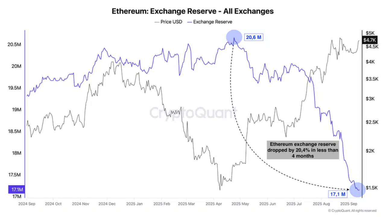 According to CryptoQuant, reserves dropped from 20.6 million to just 17.1 million in less than four months; a 20% slide, with Binance alone holding over 4.5 million ETH.