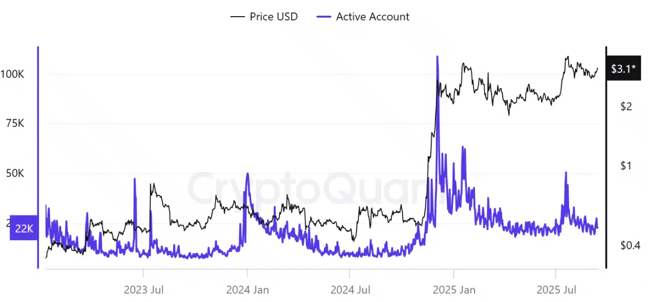 Active Addresses peaked at 108,000 in December 2024. They cooled but stabilized near 26,000. This remained above early 2025 levels of 17,500.