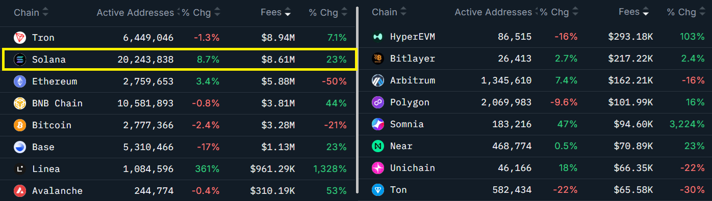 Solana’s native token SOL (SOL) faced a sharp rejection after testing the $250 level on Sunday. Even with the correction, SOL gained 24% in the past 30 days, supported by stronger onchain activity.