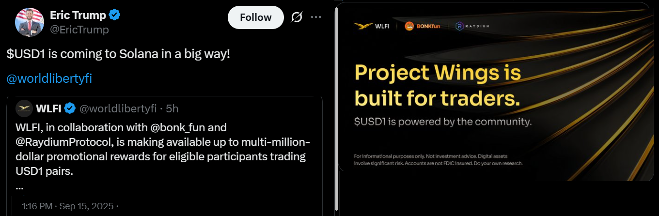 The Trump-backed crypto initiative World Liberty Financial (WLFI) also announced on Monday a partnership with Solana’s memecoin platform Bonk.fun and the Raydium DEX to fund “multimillion-dollar promotional rewards.” The effort targets USD1 stablecoin pairs, with WLFI’s token reportedly backed entirely by US dollars and cash equivalents.