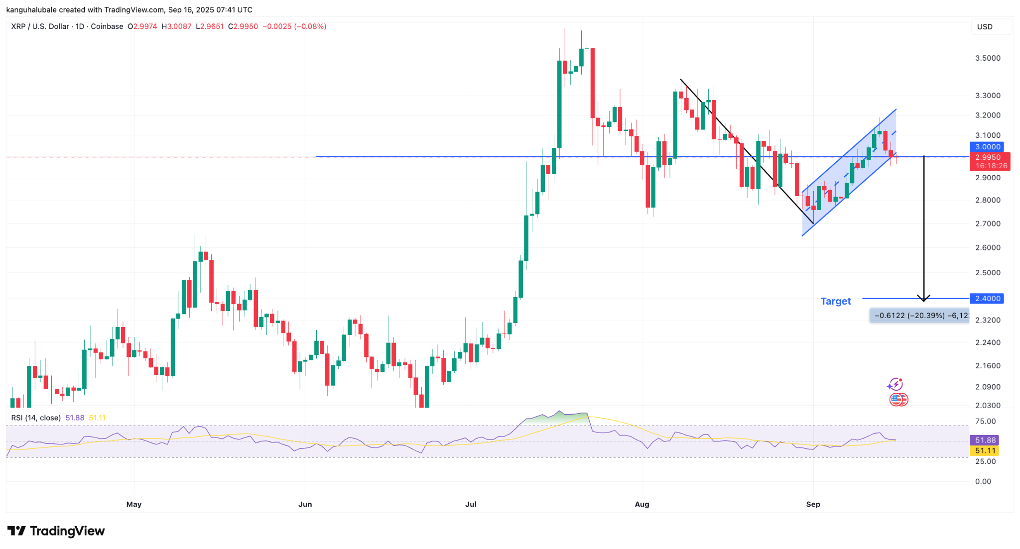 XRP’s failure to hold $3 points to a continued downside risk to $2.40-$2.00.