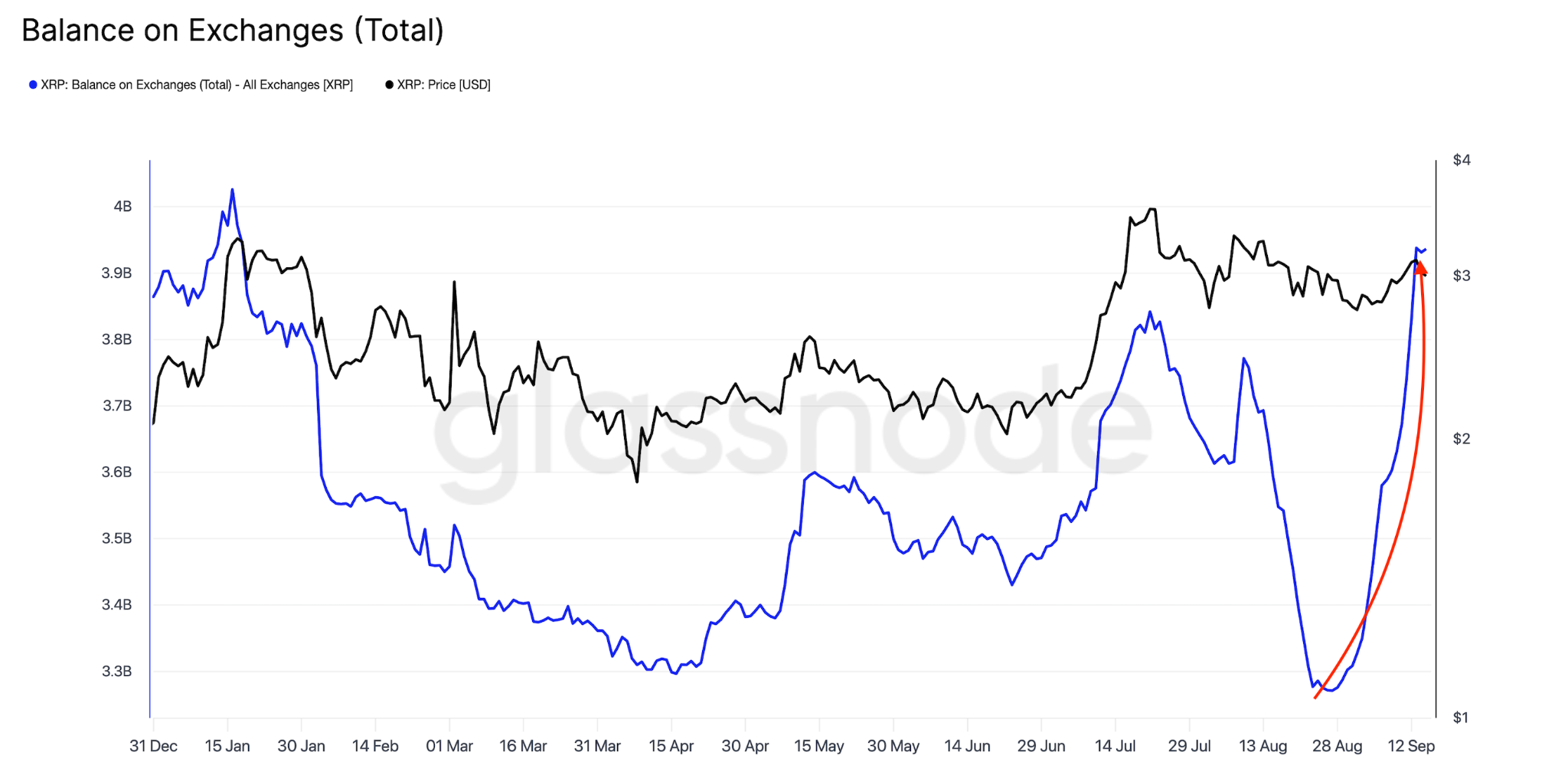 The chart below shows that the XRP balance on exchanges increased by 665 million tokens to 3.94 billion on Monday from 3.3 billion on Aug. 27, increasing the supply available for selling.