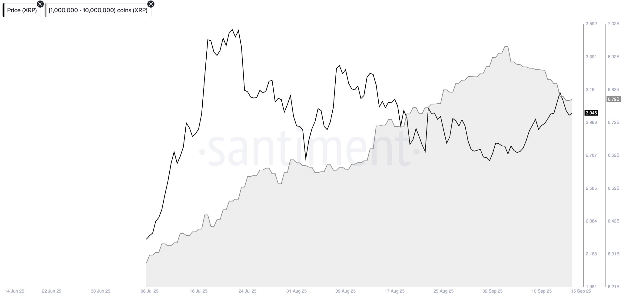 The Supply Distribution metric shows a sharp drop in the supply held by entities with a 1–10 million balance. These addresses now own 6.79 billion XRP supply, marking a six-week low.