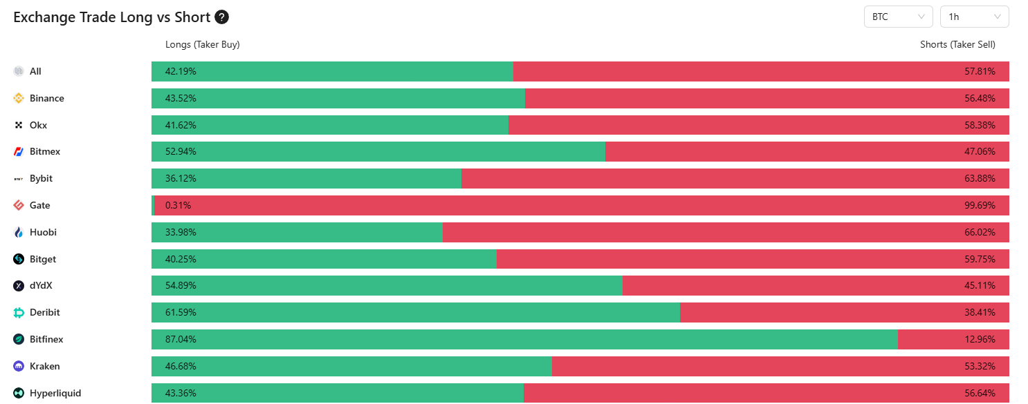 Over 57% of Bitcoin holders across all exchanges are currently short, meaning that they are betting on Bitcoin’s price decline, while only 42% remain long, according to blockchain data from CoinAnk.