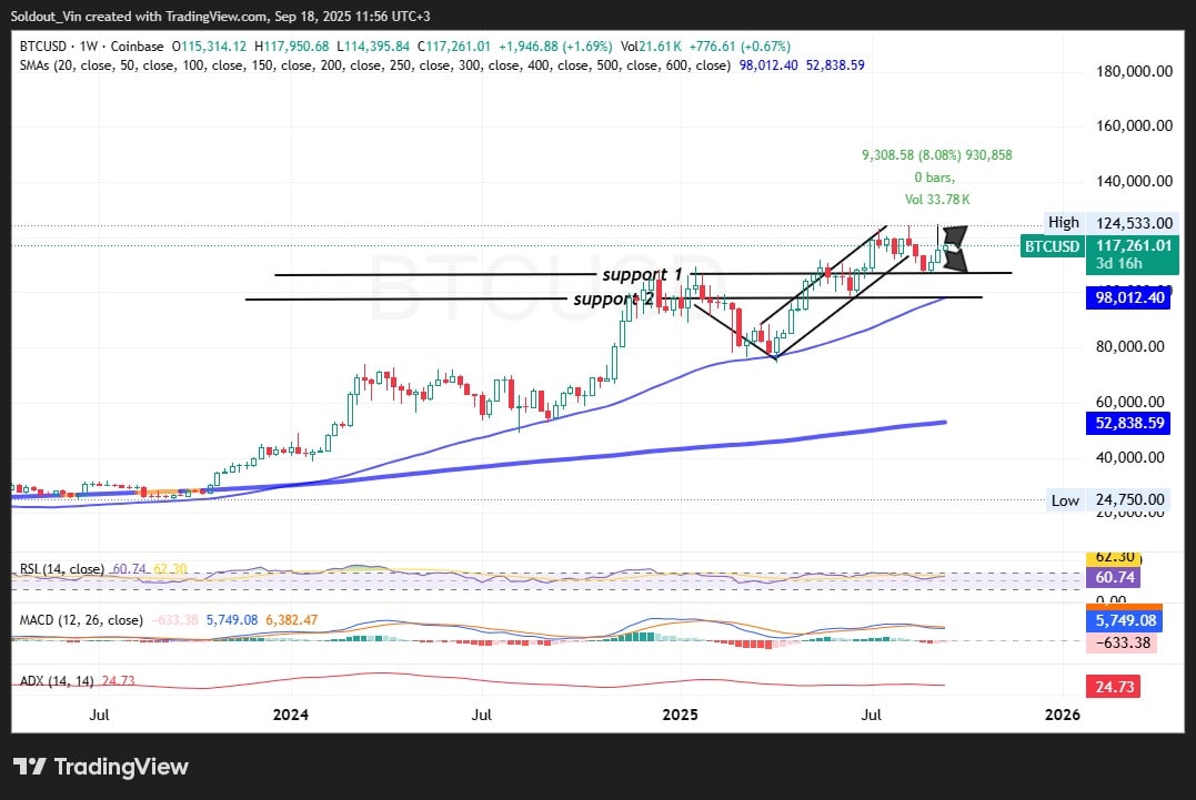 The price moving past $117,000 is a big step, with solid support levels ready to keep it steady. When combining these factors, Fed policy, blockchain data, and technical trends, the outlook is favourable for Bitcoin to continue rising and test higher price levels soon.