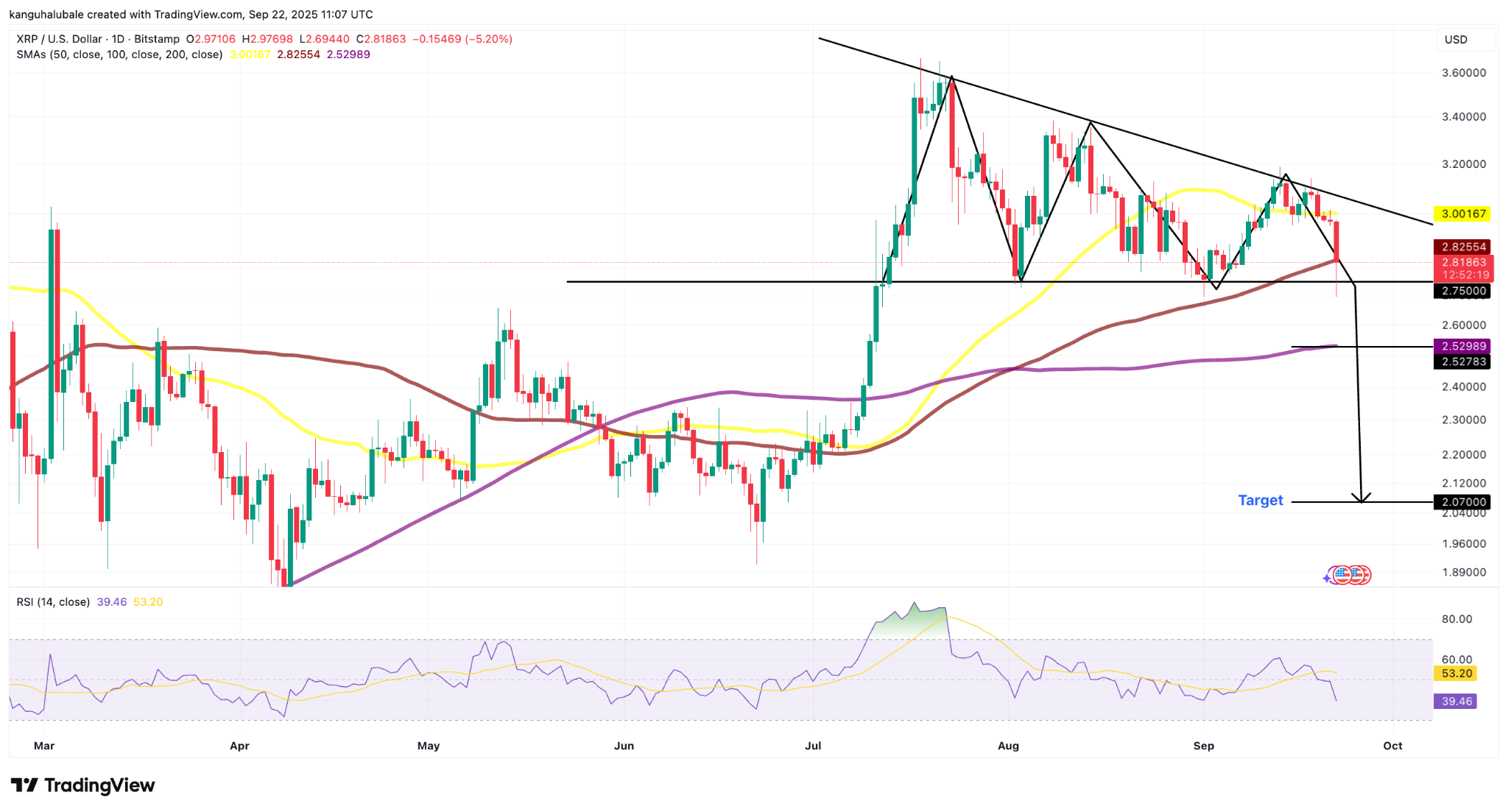 XRP price hinges on $2.75 support, risking a drop toward $2.07.