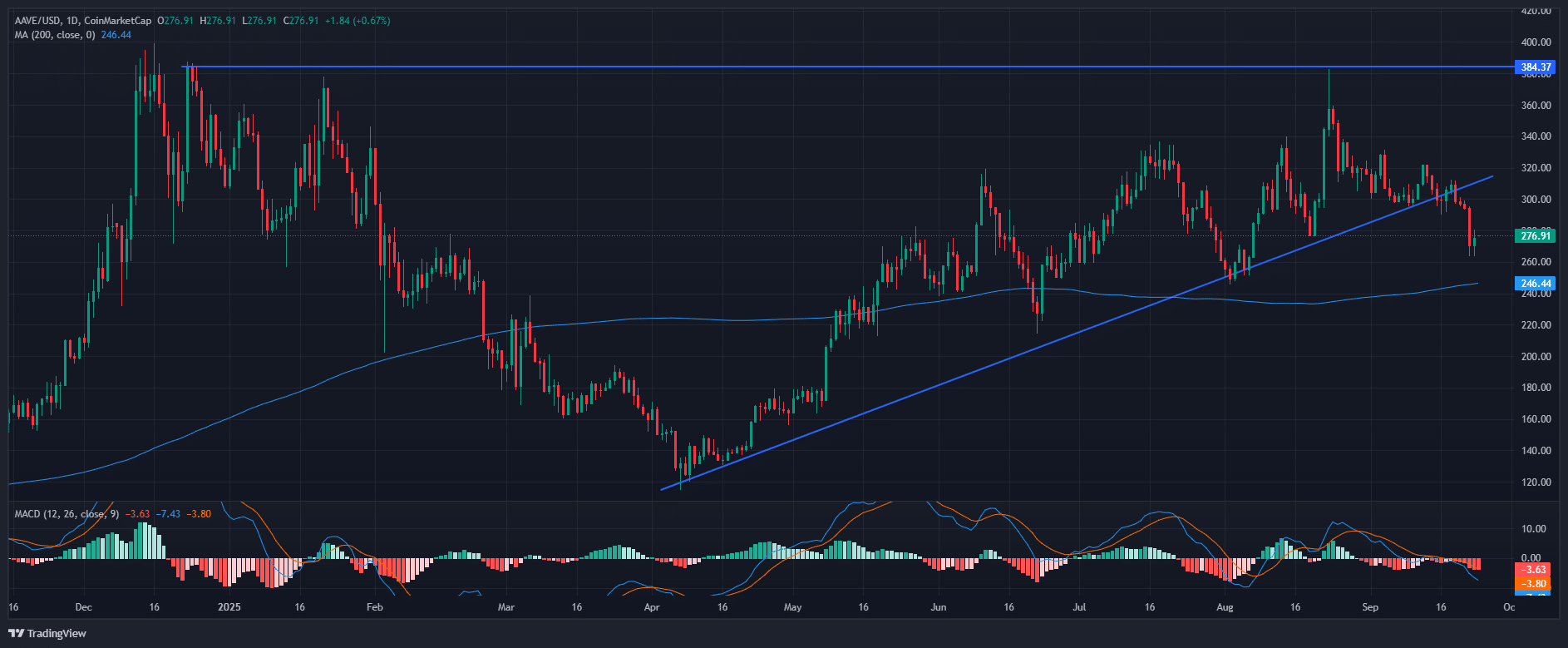 For AAVE to revisit $384, bulls needed to defend the 200 MA and reclaim the broken trendline. A breakdown under the MA could push the token into a bearish cycle.