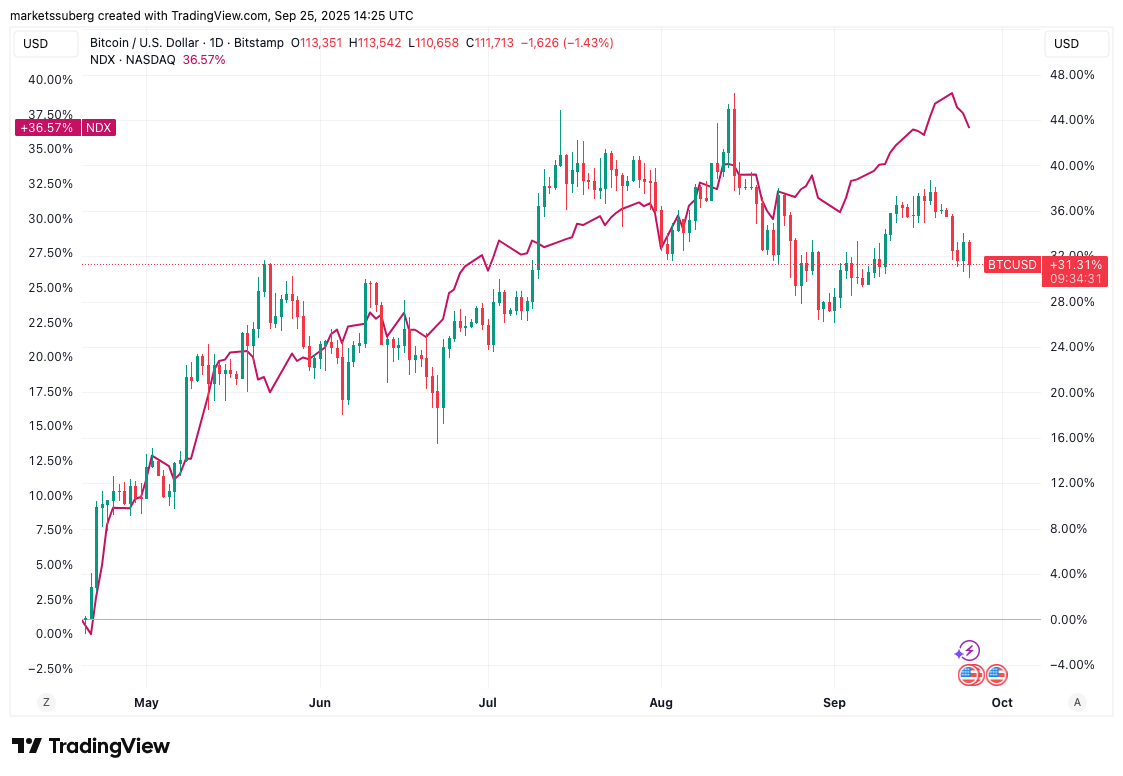 BTC/USD vs. Nasdaq 100 one-day chart. Source: Cointelegraph/TradingView