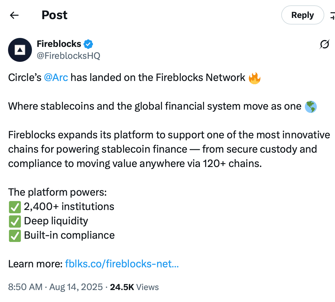 Circle plans to roll out Arc as a public testnet this fall, ahead of a full launch by the end of 2025, after integrating with Fireblocks’ digital asset custody and tokenization platform for its custody and compliance support solutions, Cointelegraph reported on Aug. 18.