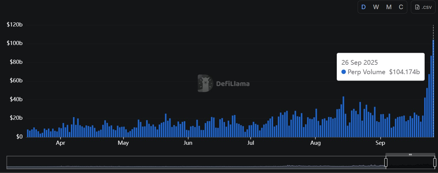 Meanwhile, Aster has sustained its rapid growth this week, driving overall perpetual DEX volumes to $104 billion on Friday, marking a fourth straight day of record daily highs.