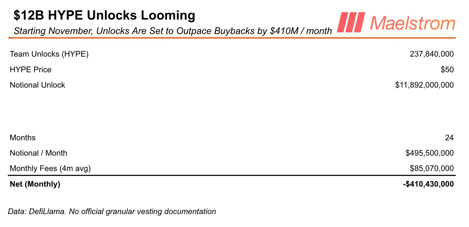 In the wider cryptocurrency market, the Hyperliquid (HYPE) token’s vesting schedule will distribute about $11.9 billion HYPE tokens over 24 months for the team, which may be the “first true test” for the resilience of the token, BitMEX co-founder Arthur Hayes’ family office fund, Maelstrom, said on Monday.