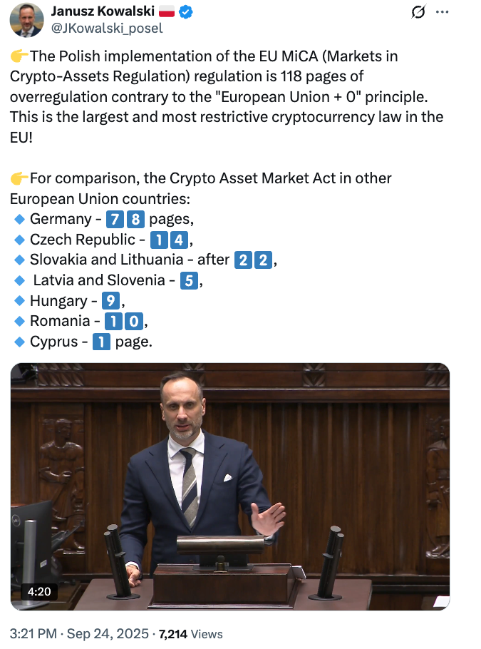 He highlighted the law’s excessive length, describing it as “118 pages of overregulation” compared with much shorter crypto legislation in Germany, the Czech Republic and other EU member states.