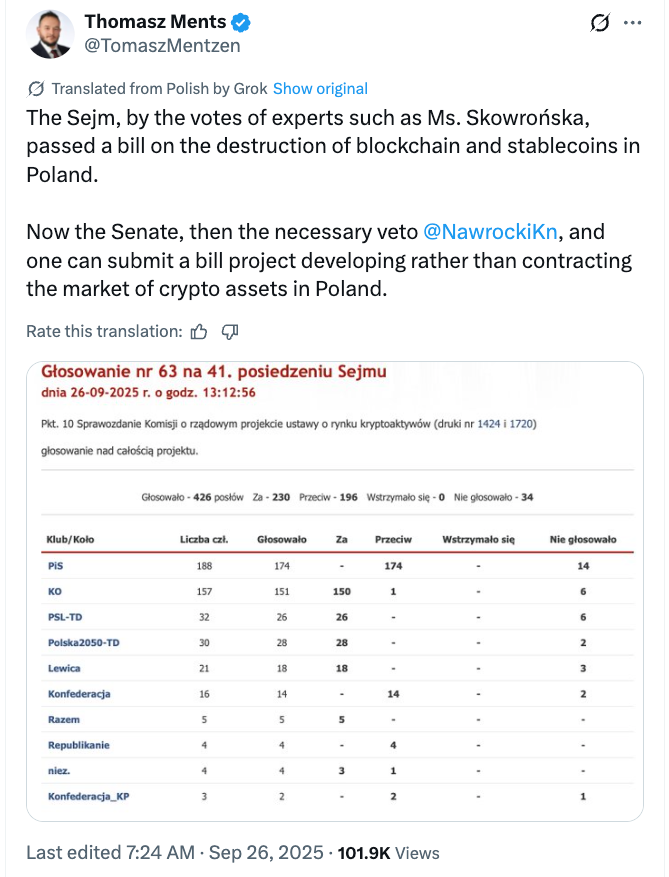 According to Mentzen, the Sejm’s approval of the bill — with “yes” votes from members including Krystyna Skowrońska — signals a potential “destruction of blockchain and stablecoins” in Poland.