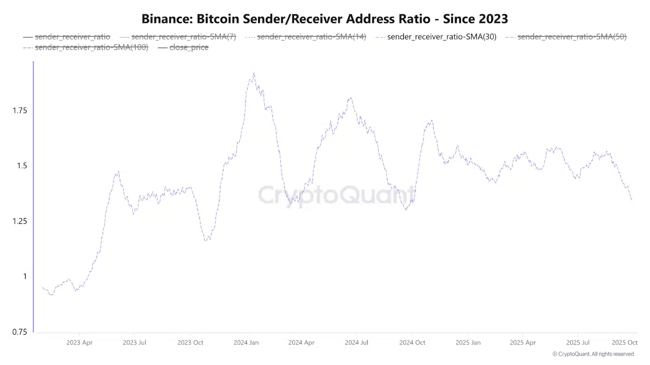 The 1-month MA of Binance’s Bitcoin sender-to-receiver ratio just hit its lowest point since early 2024.
