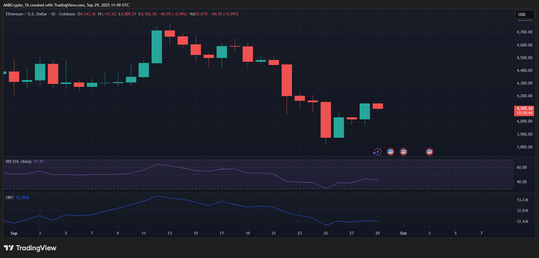 Ethereum looks to be catching its breath after the drop last week. The price has managed to bounce back above $4,100, looking stable.