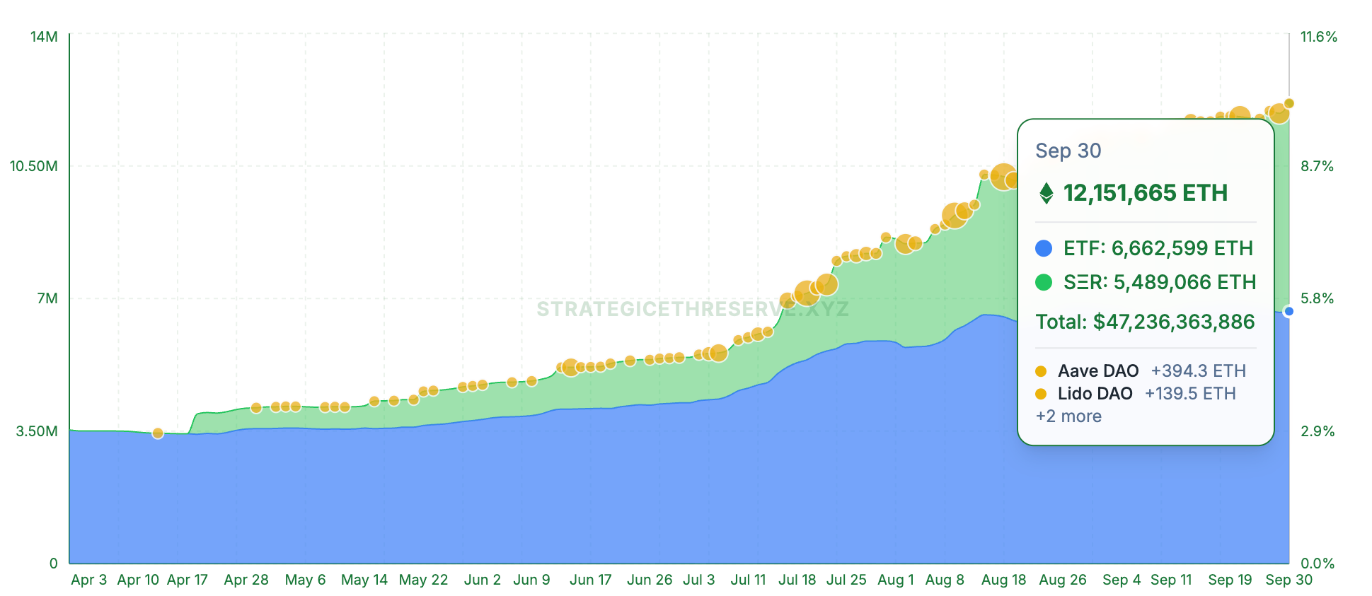 Data from StrategicETHreserve.xyz indicates that collective holdings of strategic reserves and ETFs have surged 250% since April 1, reaching 12.15 million ETH as of Tuesday.