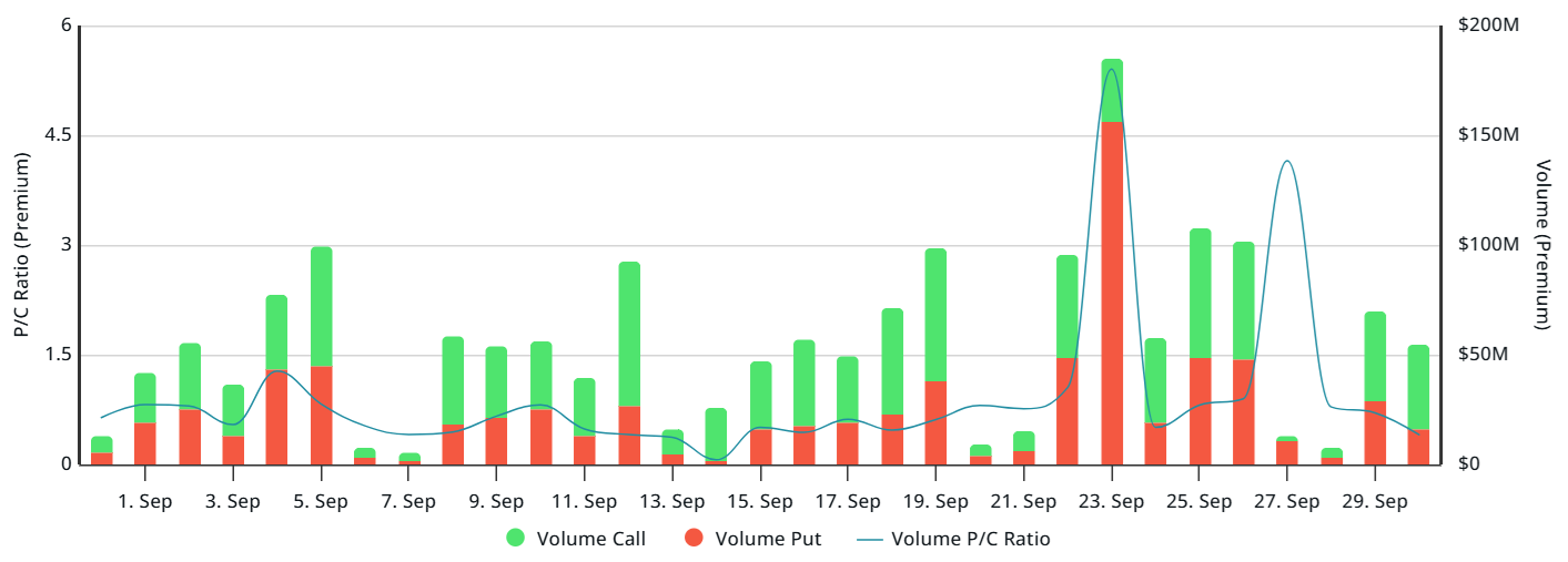 Bitcoin options premium put-to-call ratio at Deribit, USD. Source: Laevitas.ch