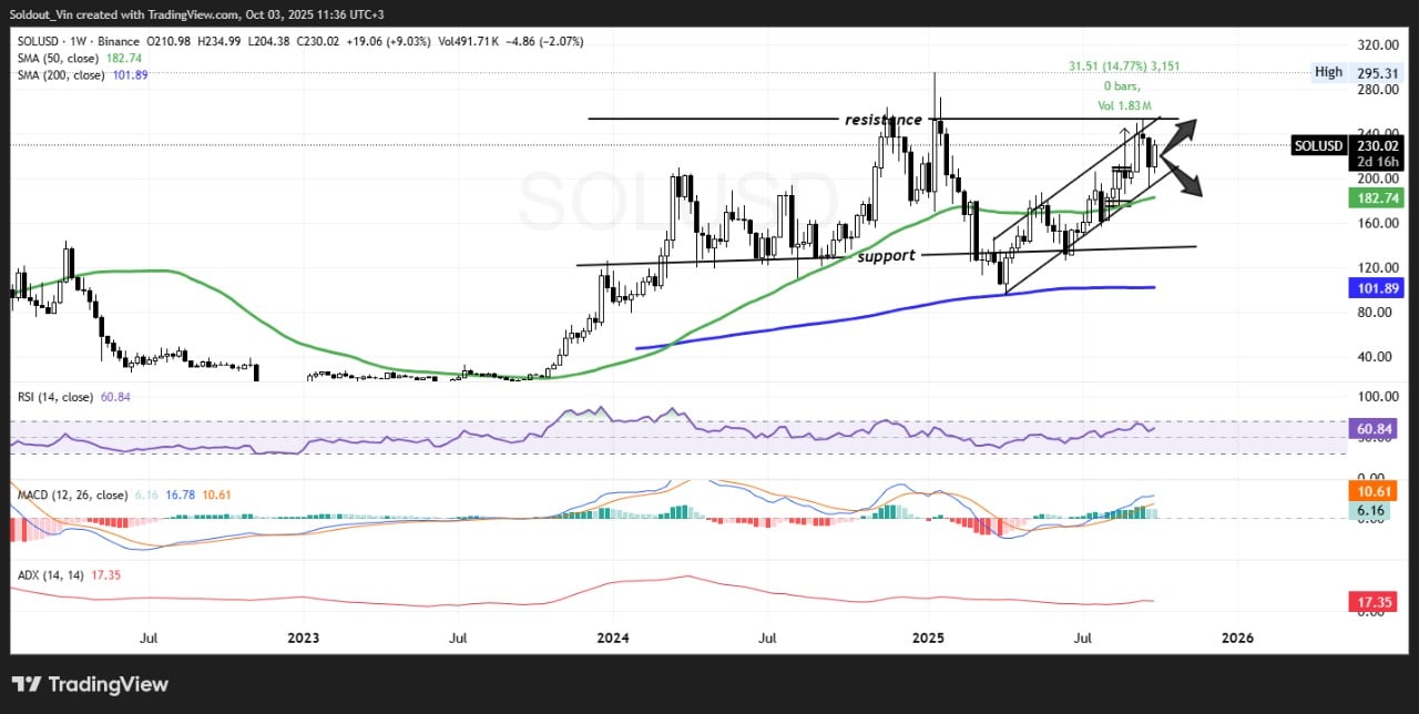 SOL is now trading well above both the 50-week and 200-week SMA ($101.89). Recent price action shows that as soon as the coin approaches the lower part of its trend channel, new buyers appear, causing the price to rebound sharply toward the $230 resistance.