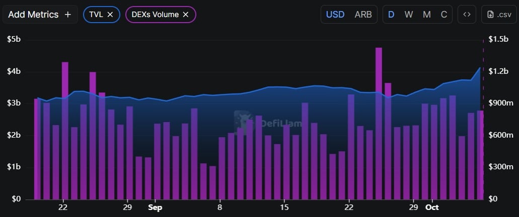 Data from DeFiLlama showed Arbitrum’s Total Value Locked (TVL) rose from $3.13 billion in September 2025 to $4.12 billion at press time, marking a steady on-chain recovery.