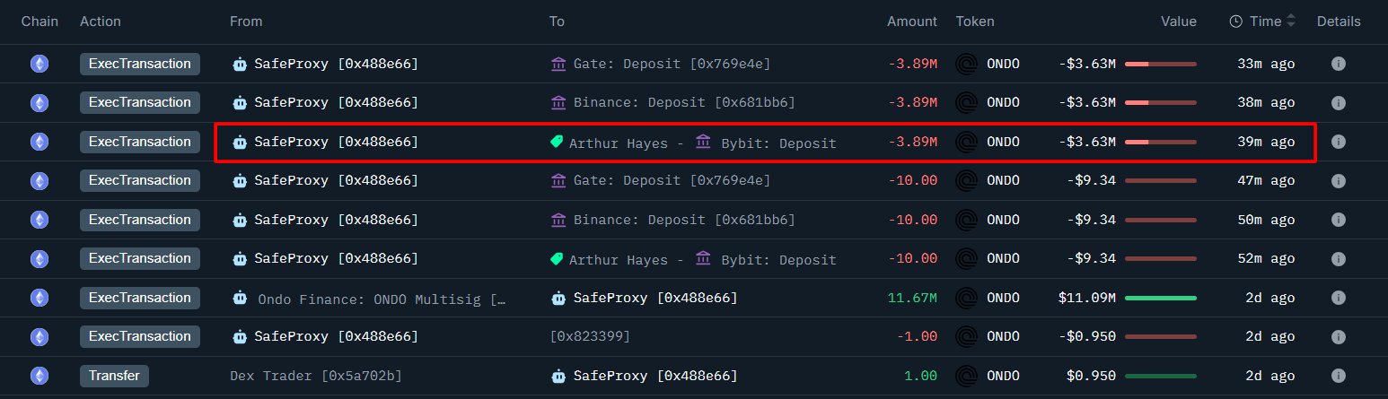 On-chain data showed massive movement of ONDO tokens into crypto exchanges, with Arthur Hayes at the center of accumulation again.