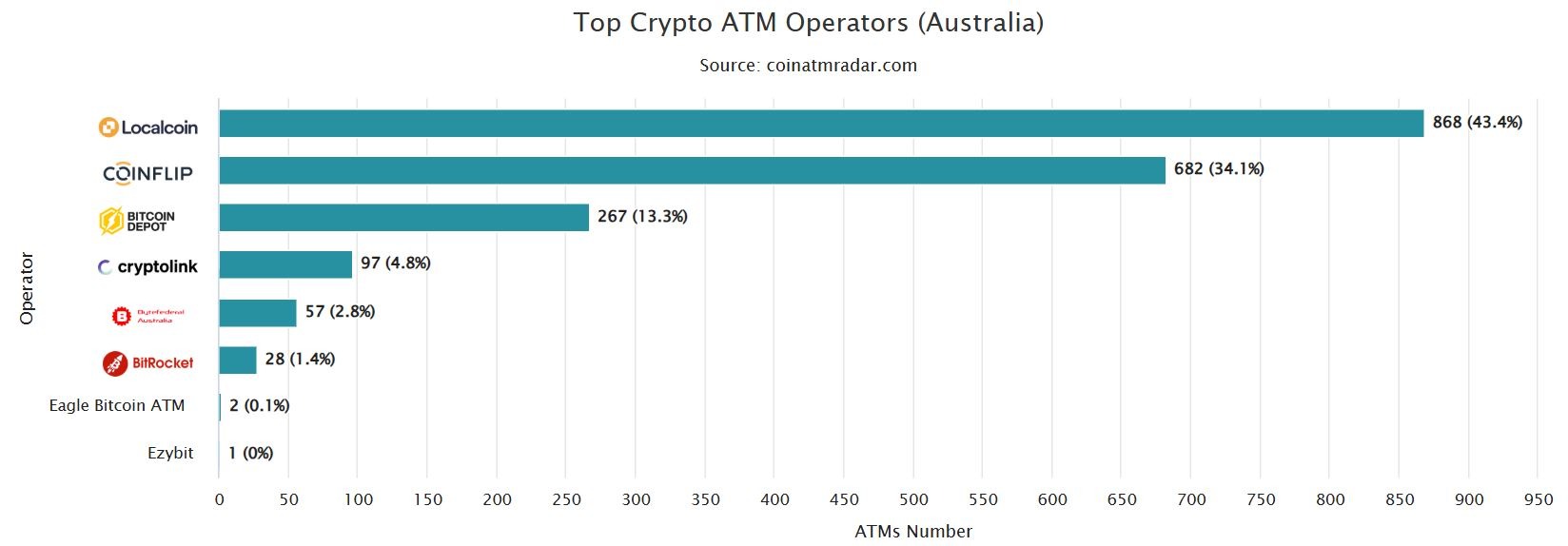 More than half the crypto ATMs in Australia are operated by three providers: Localcoin, with 868 in its stable; Coinflip, with 682 ATMs; and Bitcoin Depot, with 267.