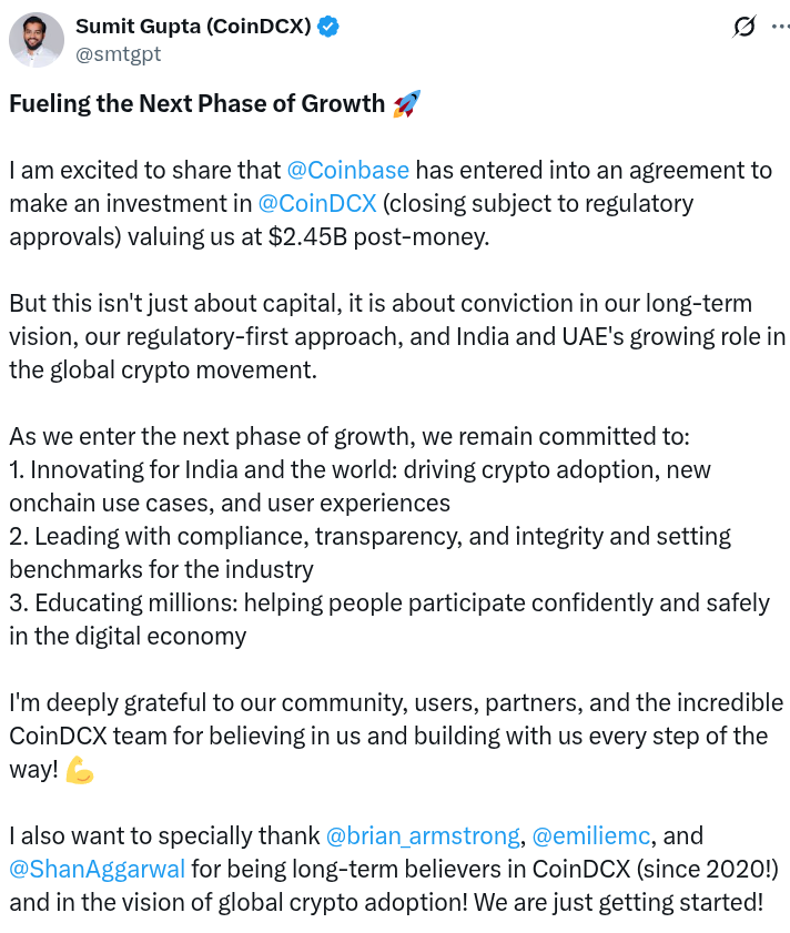 According to a Wednesday Coinbase announcement, the placement was made through the exchange’s investment arm, Coinbase Ventures. CoinDCX co-founder and CEO Sumit Gupta wrote in an X post that the investment took place at a post-money valuation of $2.45 billion.